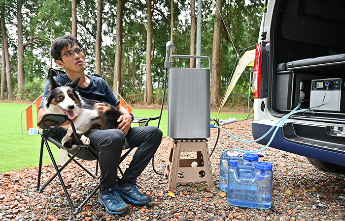 そんな時、このホットシャワーがあれば、その場でさっぱりできますね。今回実際に見て使ってみると、その便利さはすぐに理解できます。実はここには水道を引いていないんで、手洗いとかも今はタンクに貯めた水でまかなってるんです。水道のない場所で温水が使えるのはかなり魅力的です。本体もスタイリッシュでコンパクトですね。水量も十分だと思います。