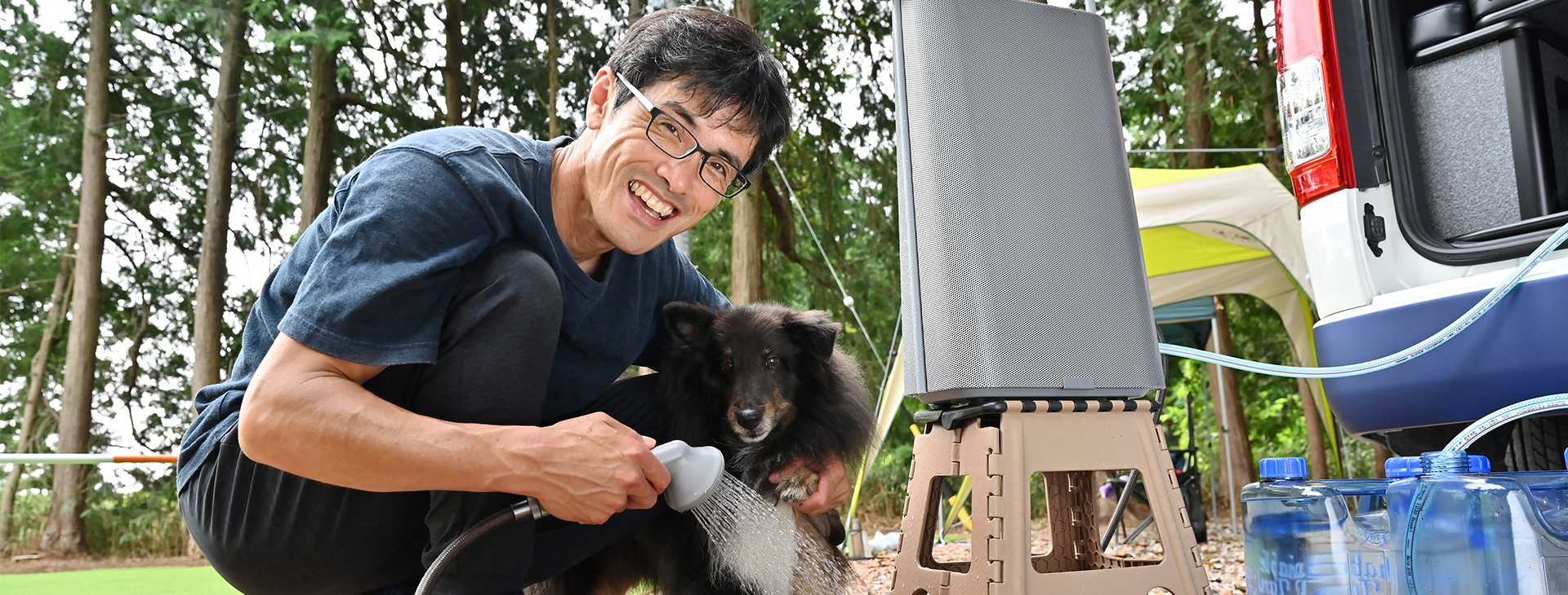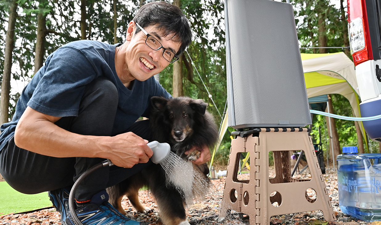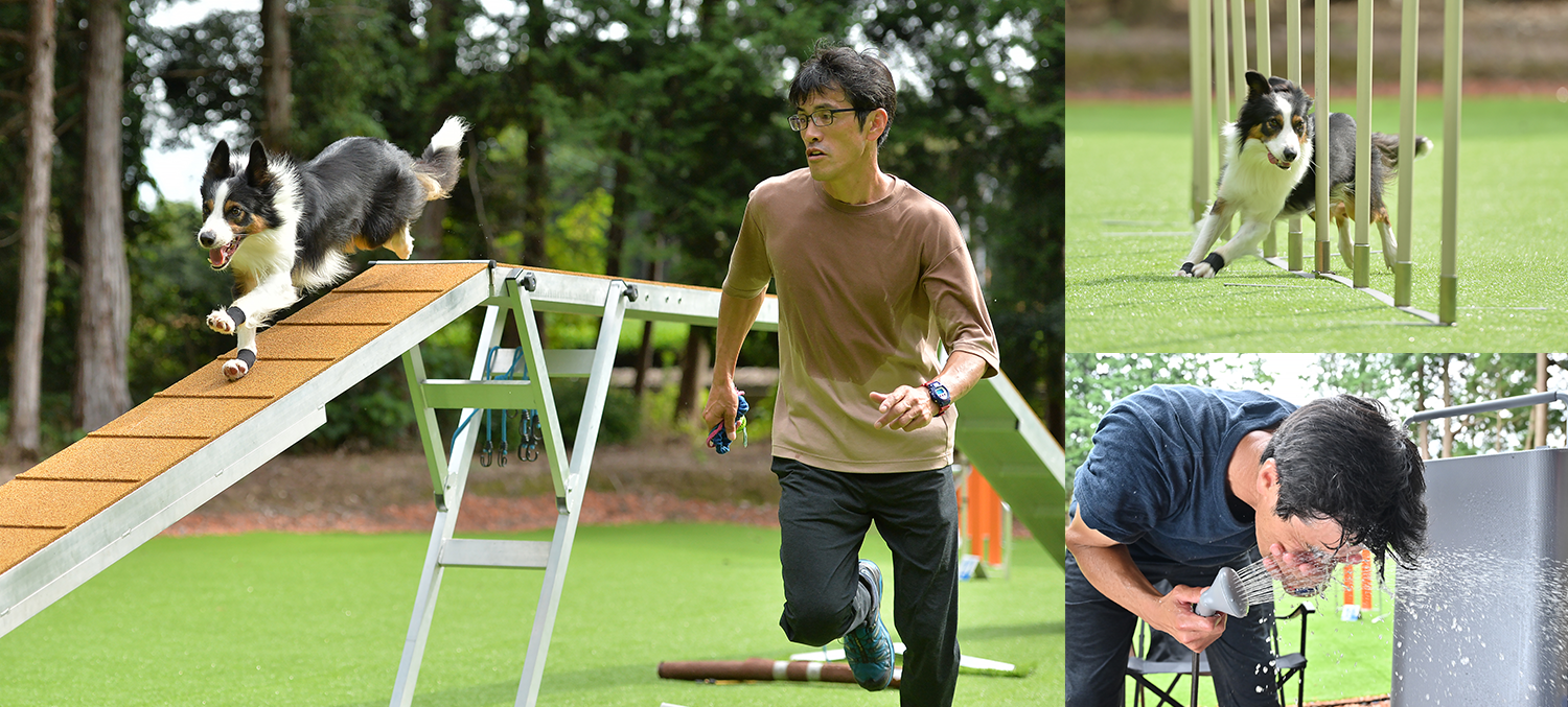 とても素直に田辺さんの言うことを聞く競技犬のルーカス君。力いっぱい走った後にスッキリしたい気持ちは人も犬も同じではないでしょうか。ちょっと水が苦手なルーカス君も体温に近い温度の温水ならば抵抗が少ないのかもしれません。初めての体験に田辺さん、ルーカス君ともに楽しそうに『HOT SHOWER SYSTEM』を囲む姿は、とても微笑ましかったです。