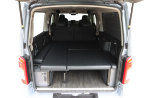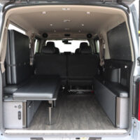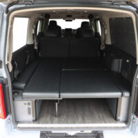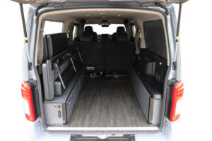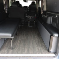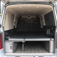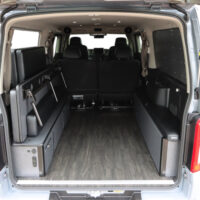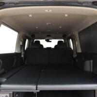 運転席側にバイクを積載し、助手席側ではオーナー様が就寝できるよう片側がフリップタイプとなっているSHシングルフリップベッドを取付けました。今回は積載するバイクのサイズに合わせて助手席側のフリップベッド幅を大人1人が就寝できる最小限のサイズでオーダー製作しています。もちろん全面展開すれば広々としたベッドスペースで車中泊していただけます。