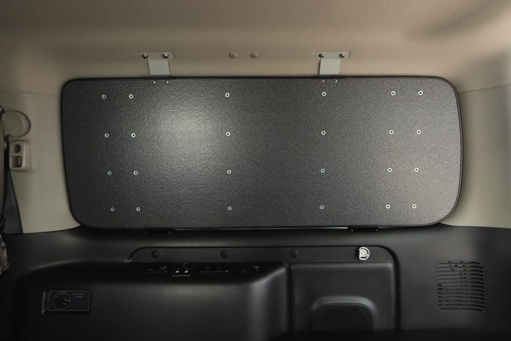 運転席側のリアウィンドウにはESウィンドウパネルを装着。窓の保護としての役割があり、バイクを積載する際にハンドルを窓にぶつけてしまっても安心。パネルにはナットが埋め込まれているのでオプションパーツなどでカスタムすることも可能です。