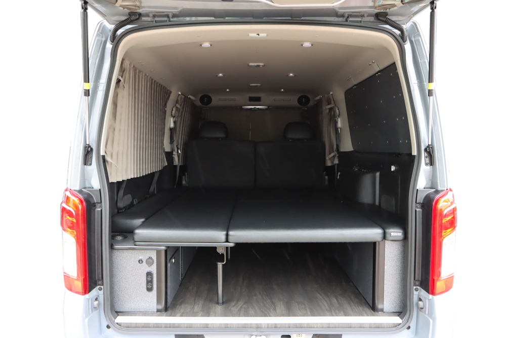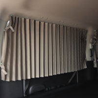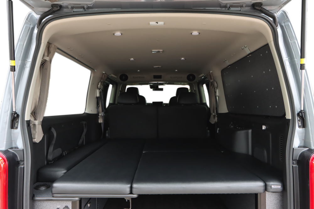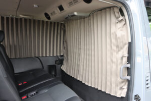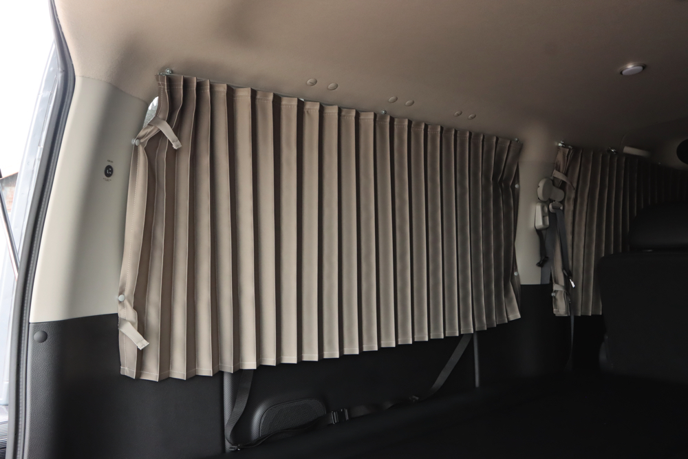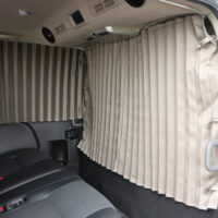 フロントシートのすぐ後の一面と、バックドアを含めた荷室4面にカーテンを取付けました。遮光性の生地を採用しているので、眩しい光や気になる視線をシャットアウト。車外の環境を気にすることなく快適に過ごしていただけます。