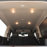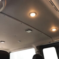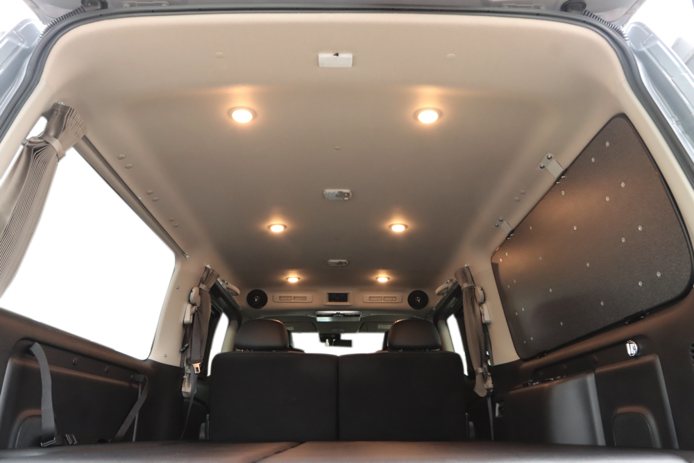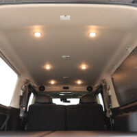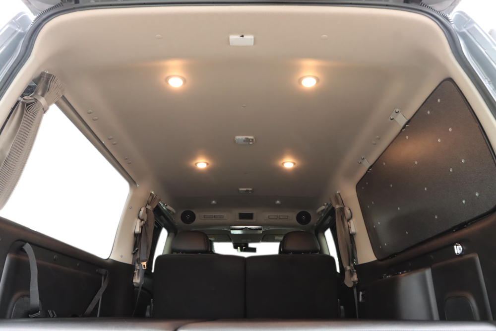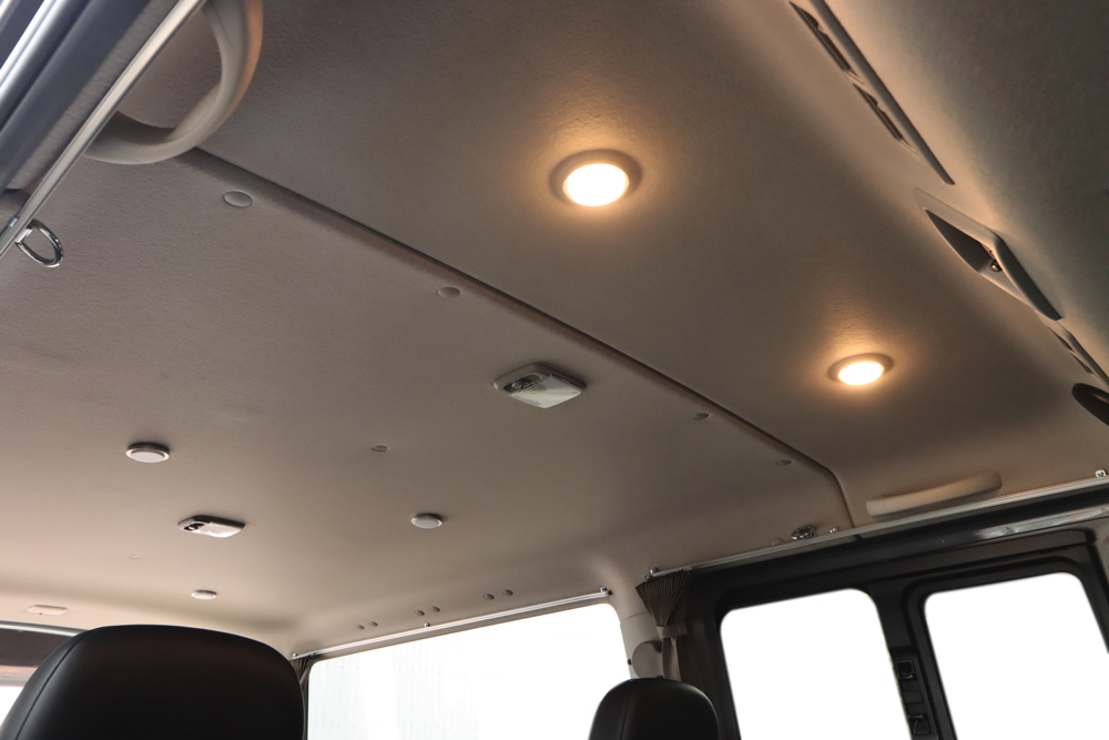 車内の天井部分には暖色カラーのLEDライトを合計6個増設しました。今回は前2個と後4個で明るさの調節ができるように調光機能を搭載。車内での過ごし方に合わせてライトも調節していただけます。