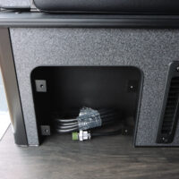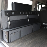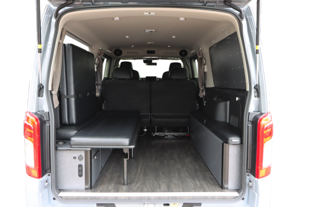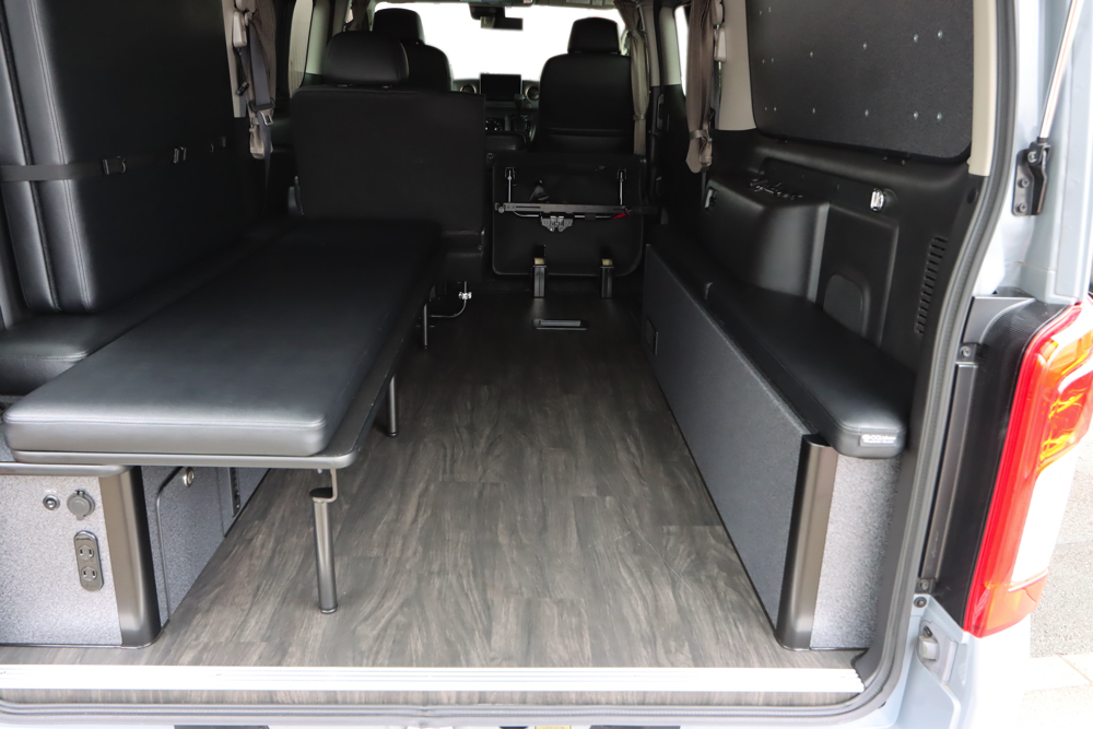 ベッドBOX内にバッテリーを組むことでエンジンを切った状態でも電力を供給することができるSHサブバッテリーシステム。メインバッテリーを気にせずFFヒーターや室内灯を使用したり、100vコンセントも搭載しているのでスマホを充電したり小型扇風機などを使用していただけます。