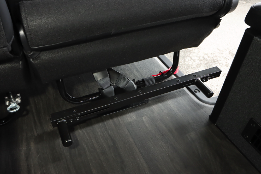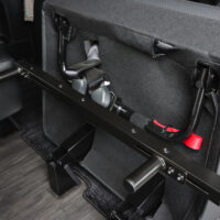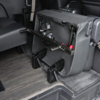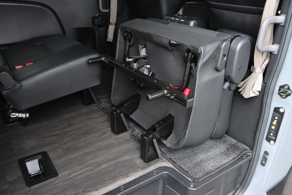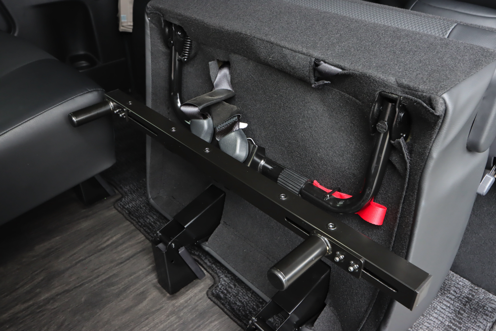 キャラバン プレミアムGXの分割タイプのセカンドシートに取付けることができるタイヤストッパーです。バイクを積載した際フロントタイヤをストッパーに当てて固定することで、フロントタイヤがずれてしまう心配がなく、走行中も安心・安全です。シート展開時・跳ね上げ時どちらでも使用することができます。