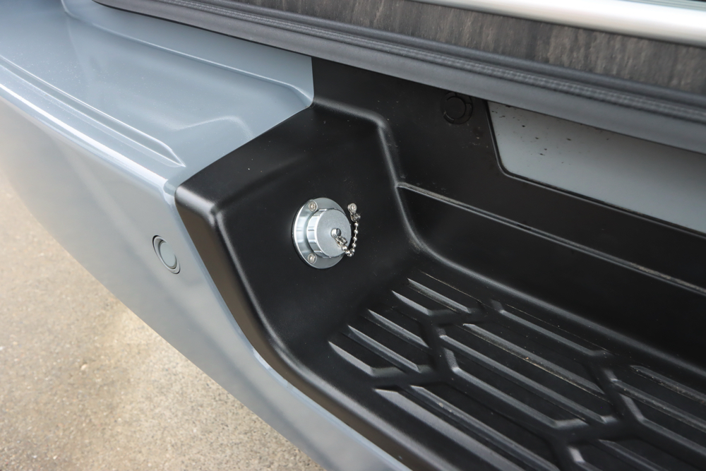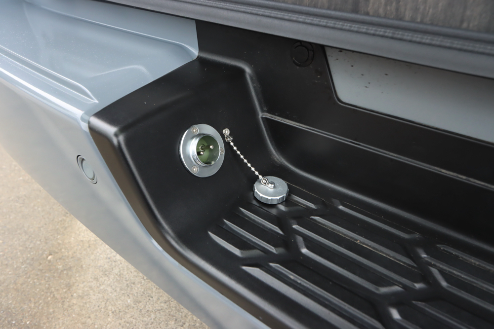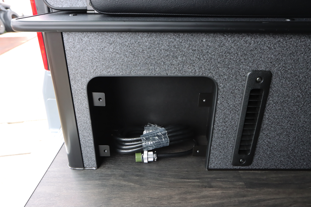 宿泊施設や自宅など外部にあるコンセント(AC電源)から電源を供給することができるSH外部電源システム。車内で長時間過ごす際やサブバッテリーを充電する際は外部電源が重宝されます。差し込み口はリアステップ部分に取付けました。