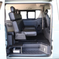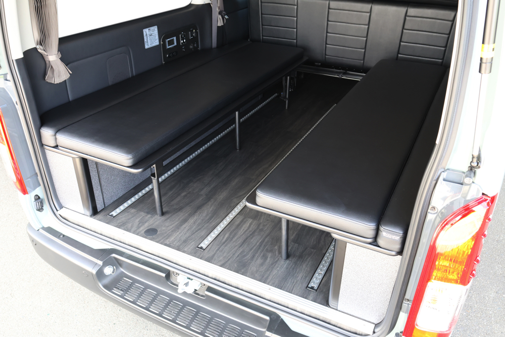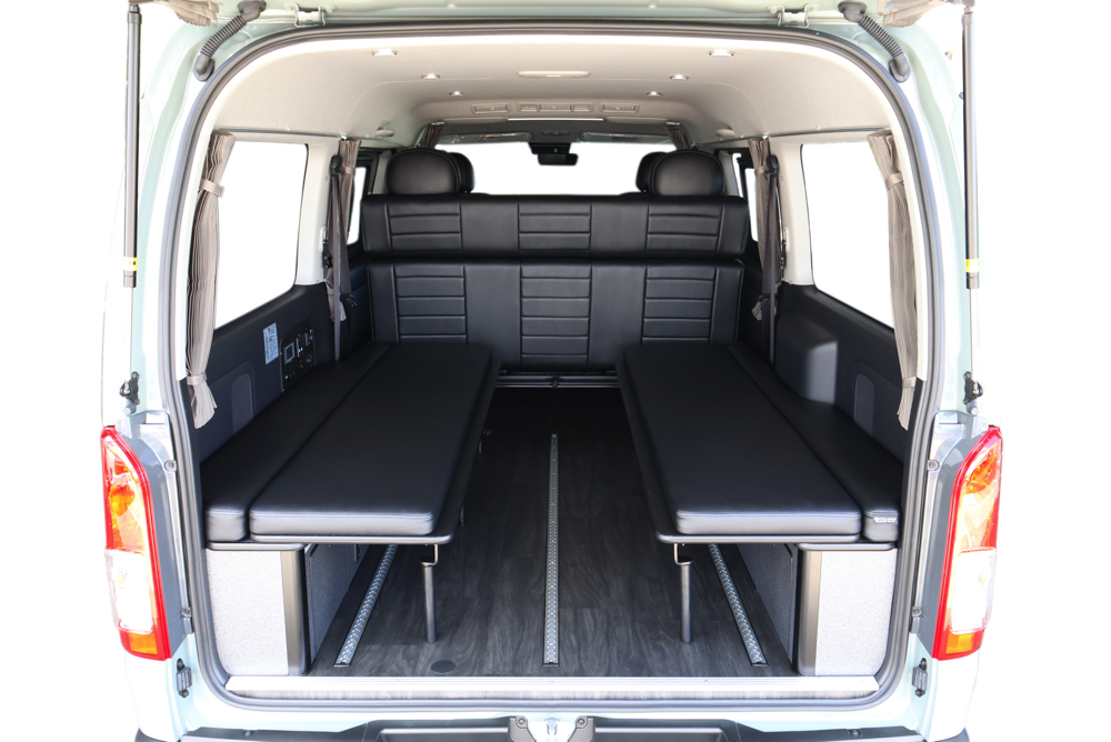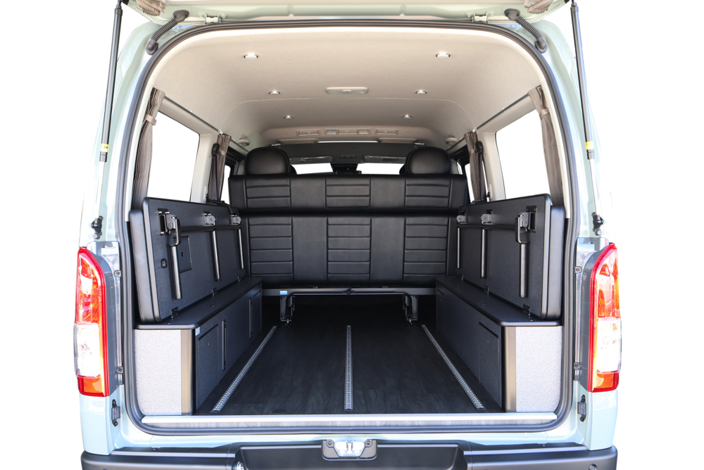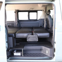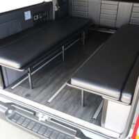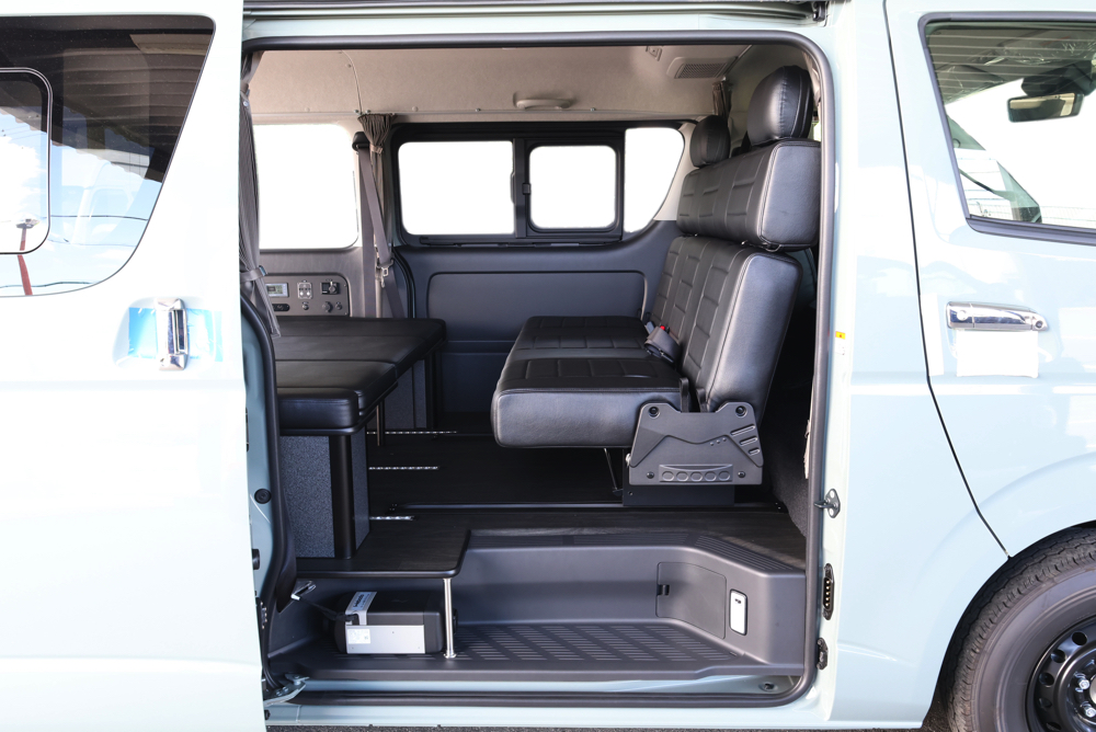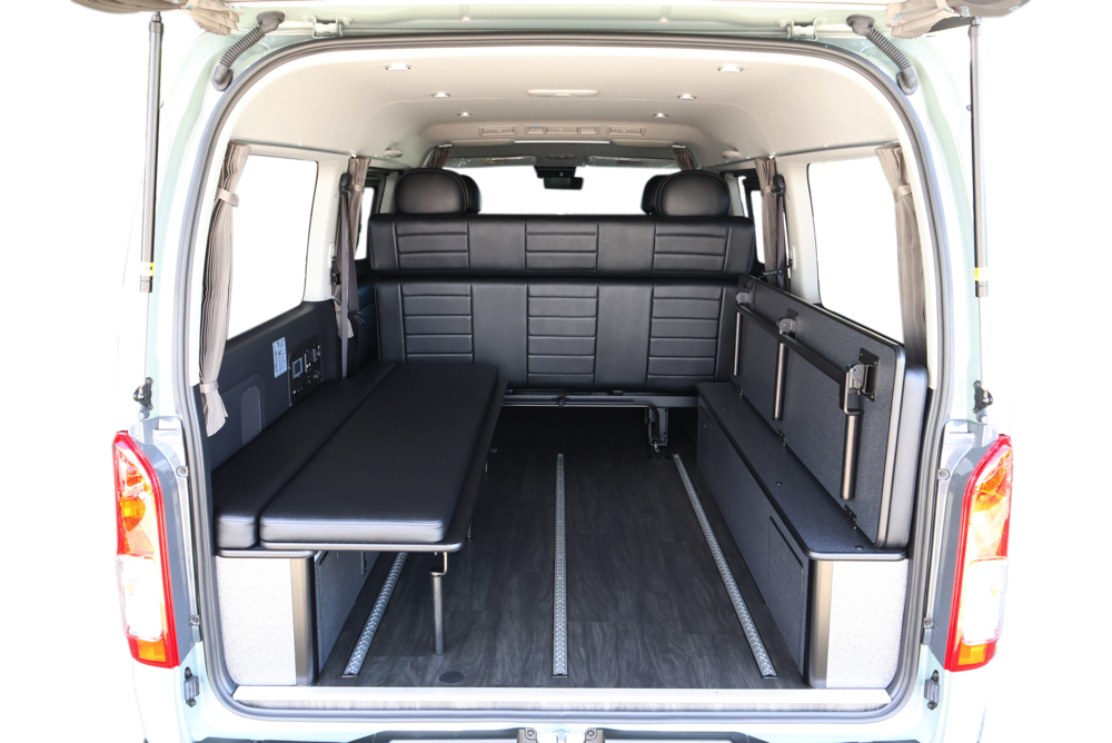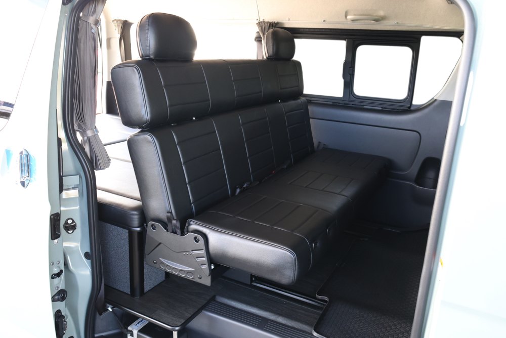 室内の機能性をアップするため、純正セカンドシートからSTシートへ交換しました。前向き・後向き・ベッド展開ができるシートとなっていて、SHダブルフリップベッドと組みわせることで広々と寛げるベッドスペースが誕生。シートレールも埋め込んでいるため、純正シートではできない前後移動が可能に、一番前にシートをずらして長物やより多くの荷物を積載していただけます。