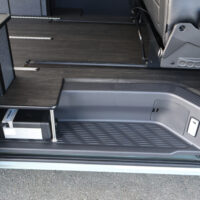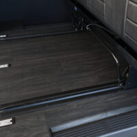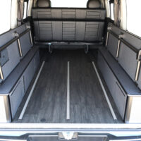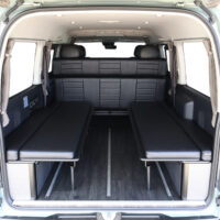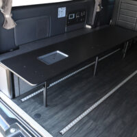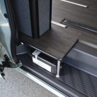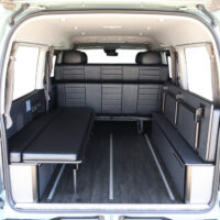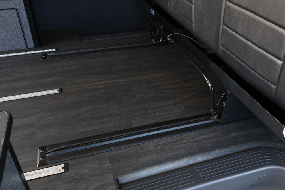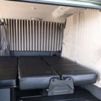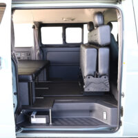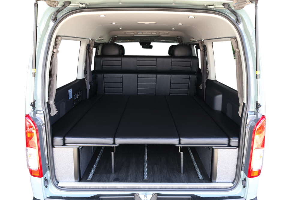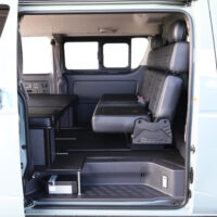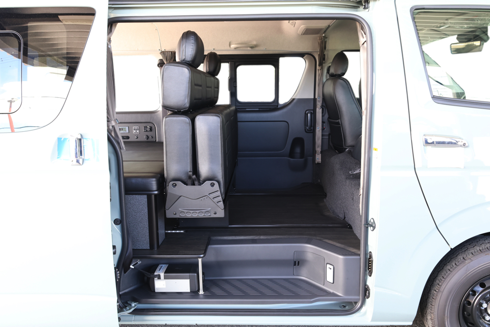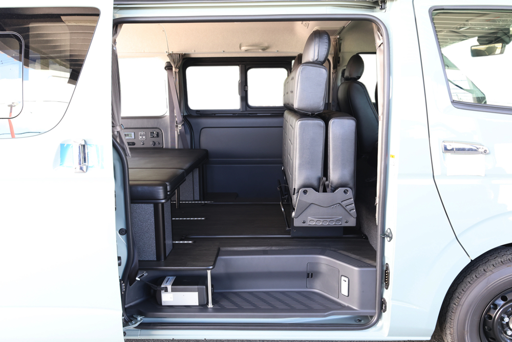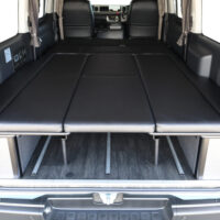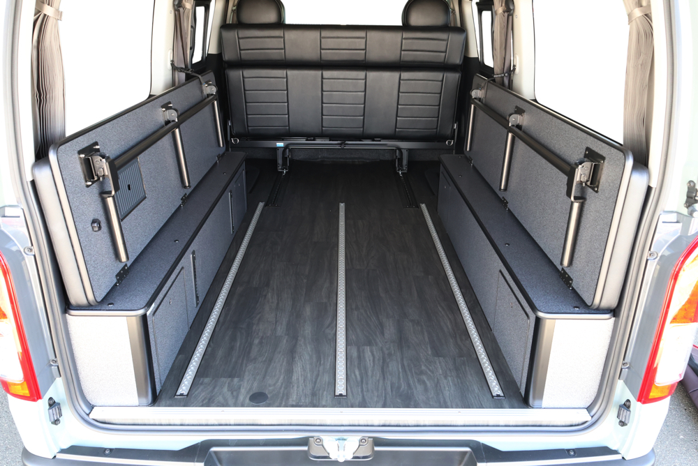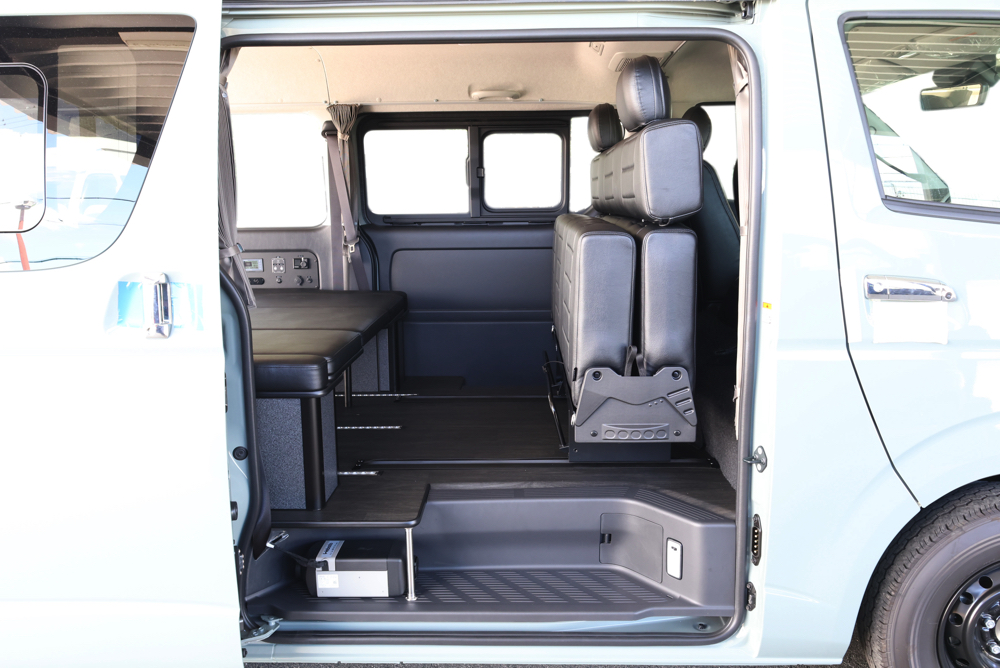室内の機能性をアップするため、純正セカンドシートからSTシートへ交換しました。前向き・後向き・ベッド展開ができるシートとなっていて、SHダブルフリップベッドと組みわせることで広々と寛げるベッドスペースが誕生。シートレールも埋め込んでいるため、純正シートではできない前後移動が可能に、一番前にシートをずらして長物やより多くの荷物を積載していただけます。