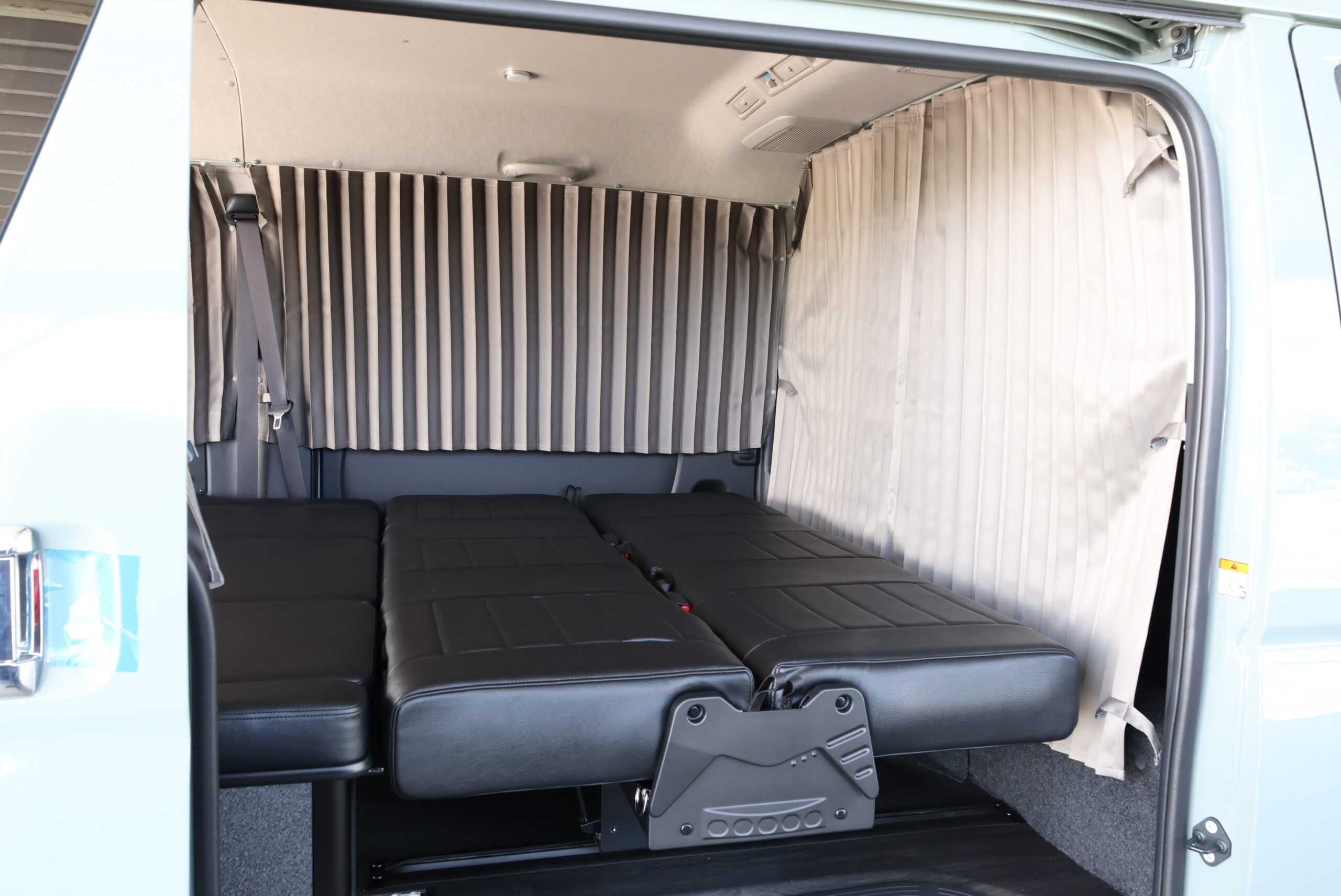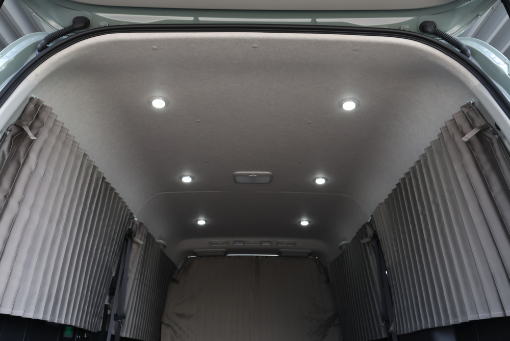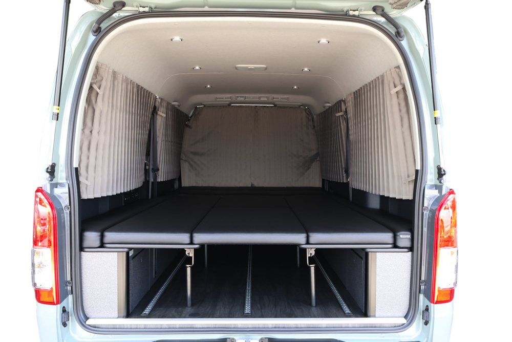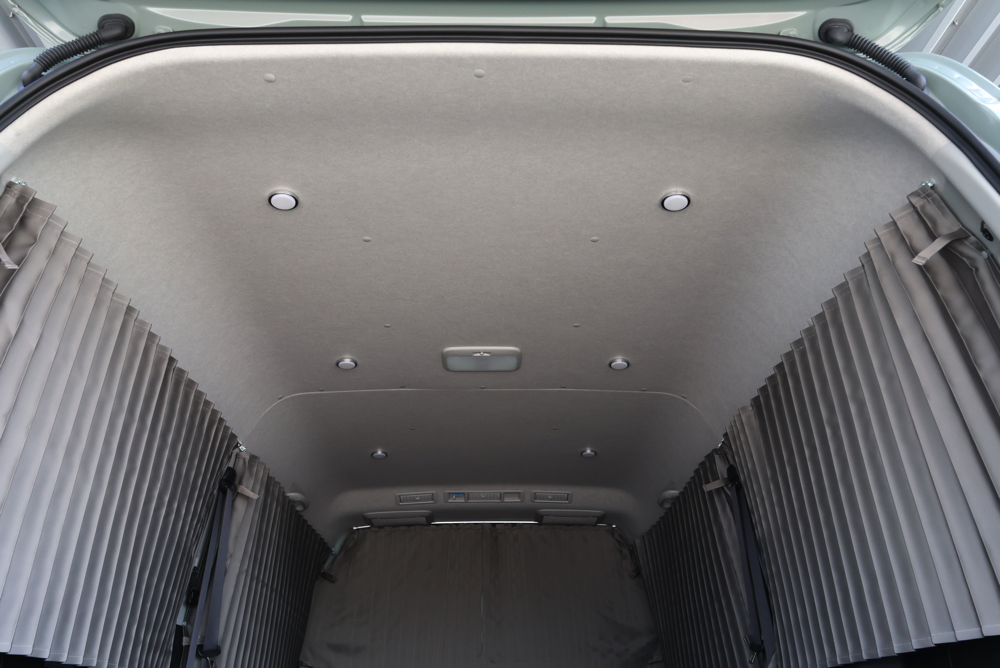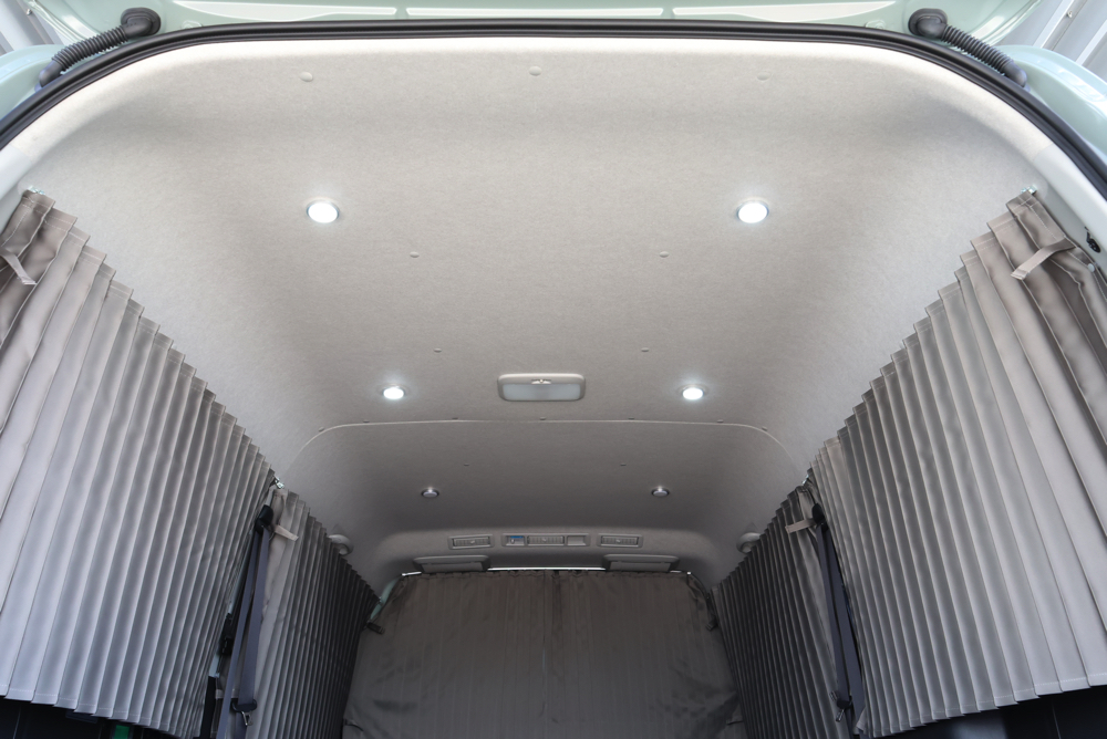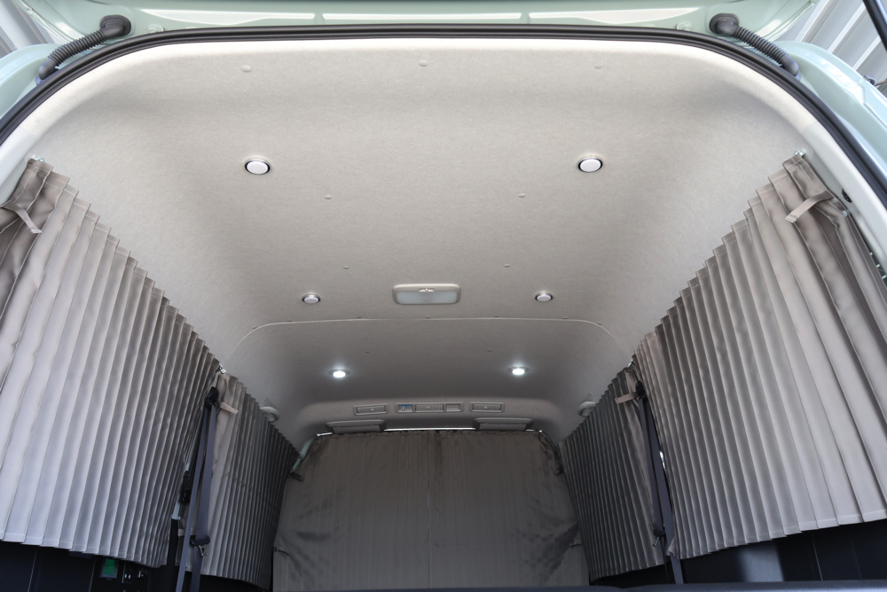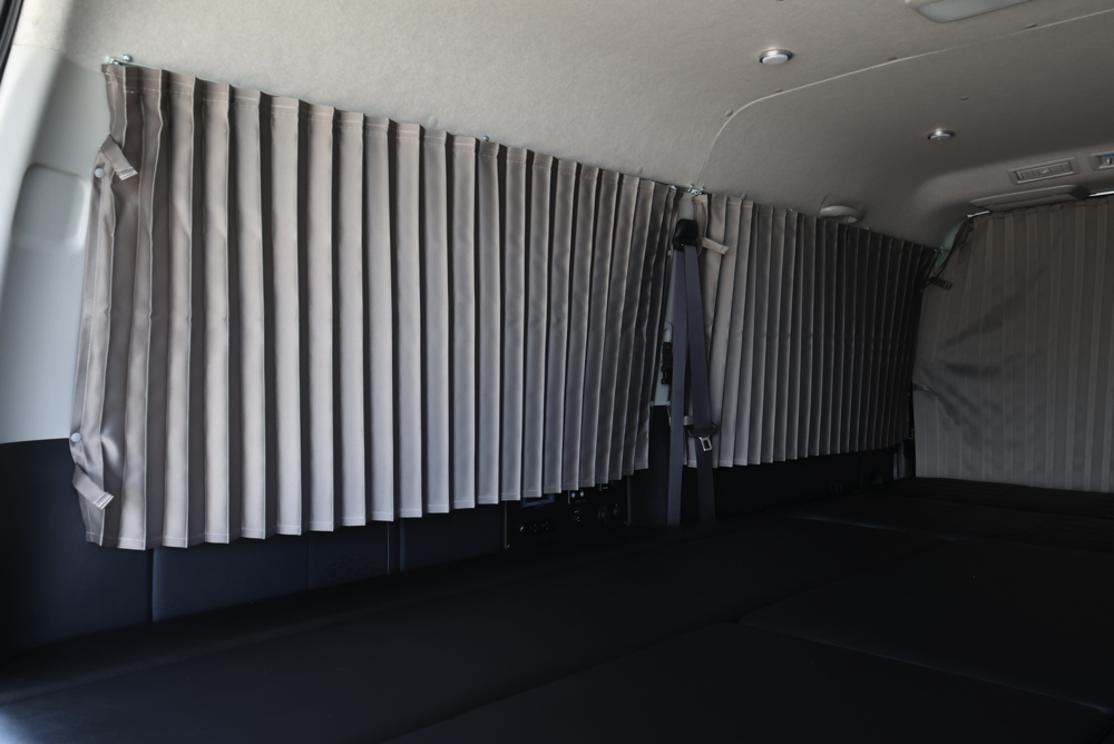 車中泊ユーザーに人気なSHセンターカーテンとSHカーテン施工。遮光性に優れた生地を採用しているので、カーテンを閉め切ることで気になる外からの視線や眩しい光をシャットアウト。プライベートが守られた室内で快適に過ごしていただけます。