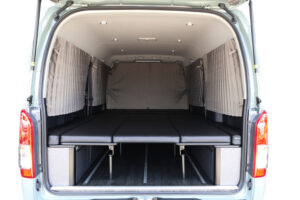 夫婦2人やワンちゃんと一緒に車中泊できるように、ベッドはSHダブルフリップベッドをチョイス。左右がフリップベッドとなっていて、全面展開・左右ベッド展開・片側ベッド展開・ベッド収納と様々なベッド展開ができるので、就寝人数、使用用途に合わせてカスタムしていただけます。