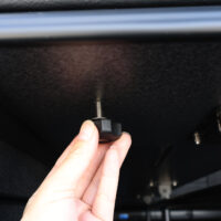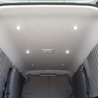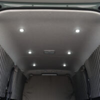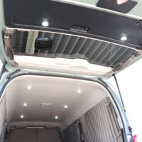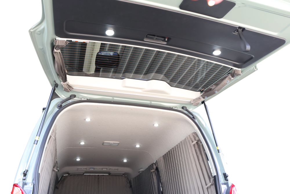 暗い時間でも明るい室内で過ごせるように、室内天井に6個、バックドアに2個、合計8個のLEDライトを増設しました。室内ライトはフロント側2個、リア側4個でそれぞれ点灯できるように調光機能を搭載。バックドアにもライトがあることで乗り降り時や荷物載せ下ろしの際も手元・足元を明るく照らしてくれます。