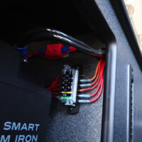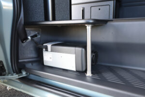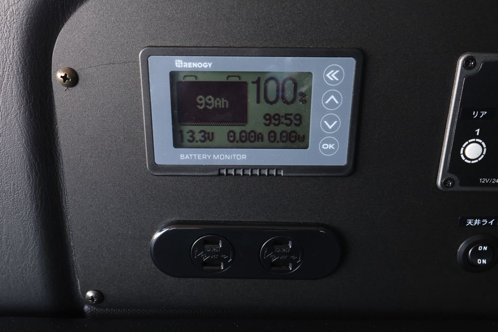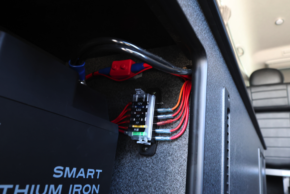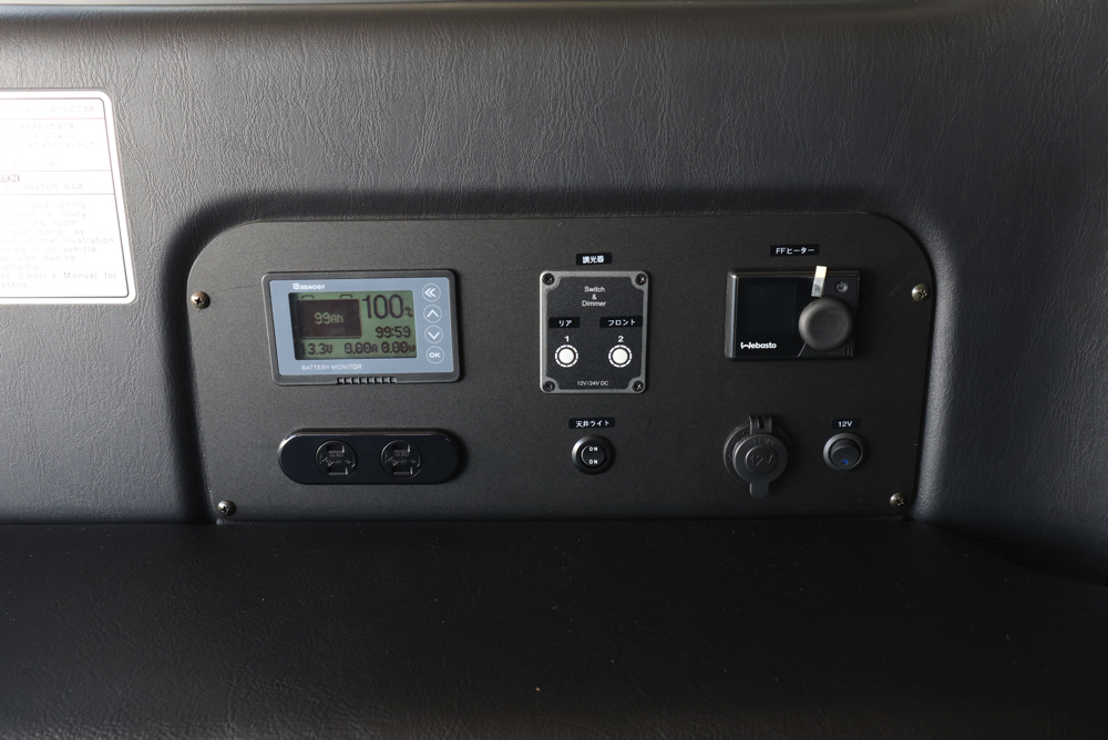 助手席側のベッドボックス内にはSHサブバッテリーを搭載し、内張側面にバッテリーコントローラーやコンセントをカスタムしました。サブバッテリーがあることで、車中泊キャンプや休憩中など車のエンジンを切った状態でも、家電製品の使用が可能。メインバッテリーを気にせず、ヒーターやLEDライトなどが使えるので、快適に室内で過ごしていただけます。