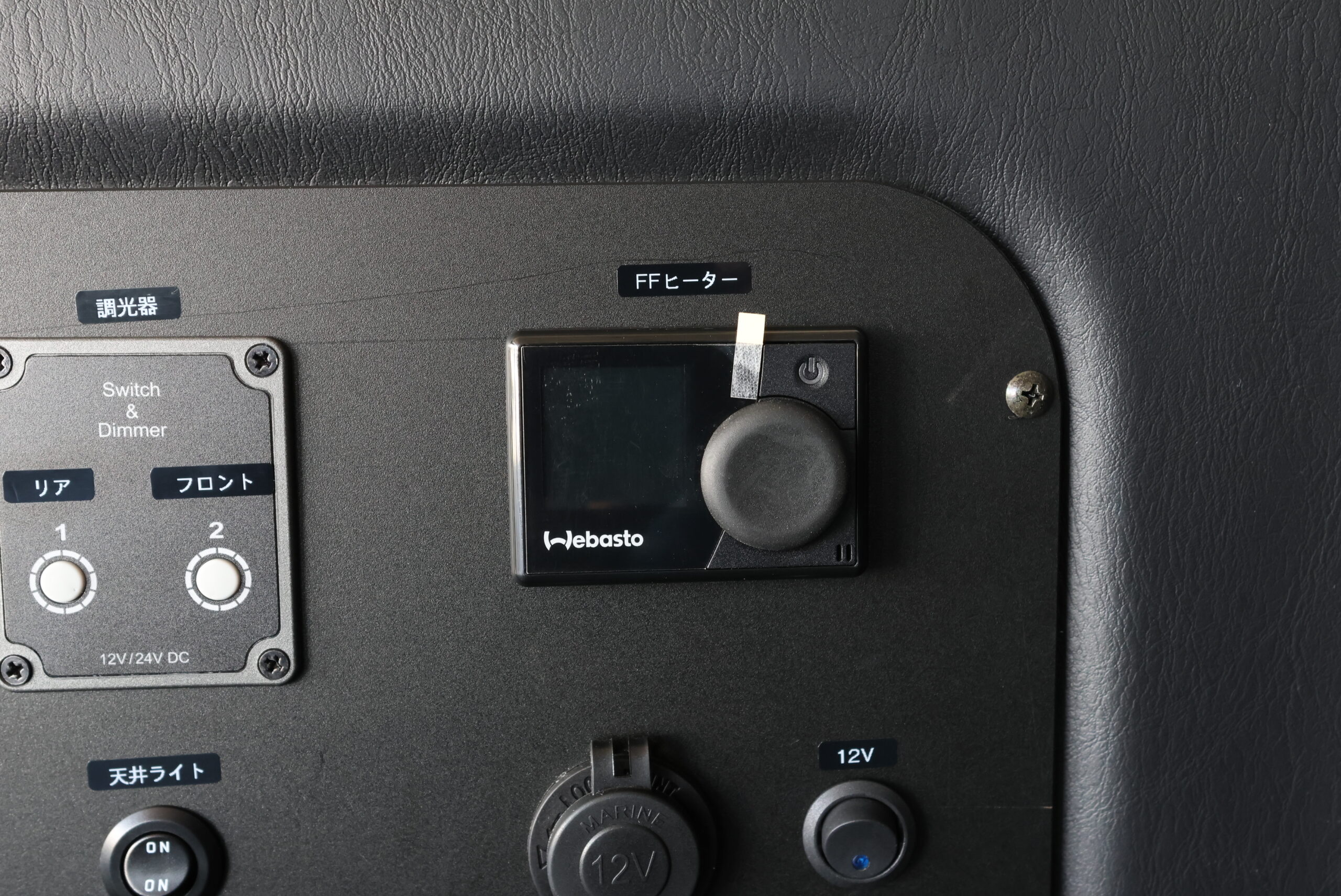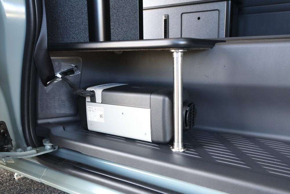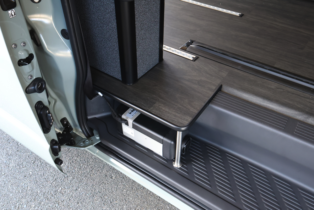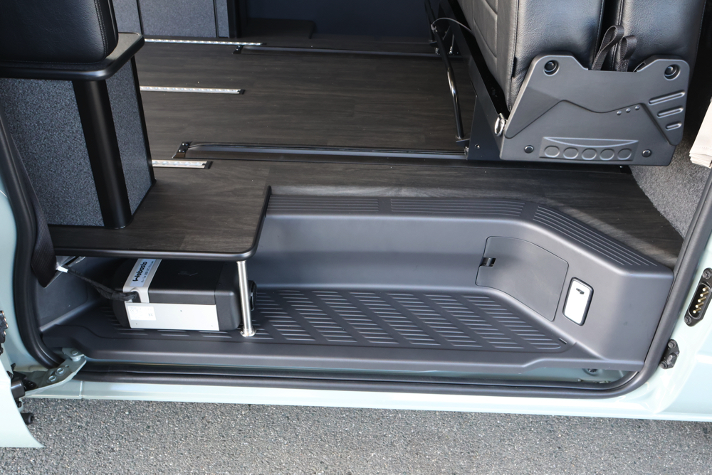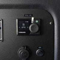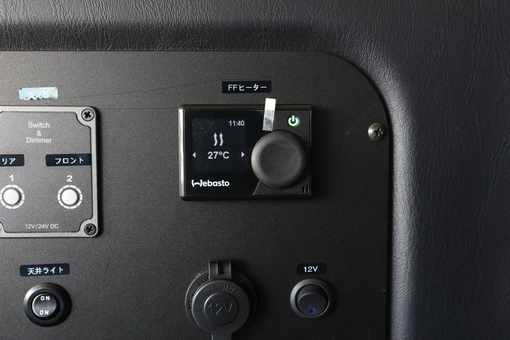 運転席側のステップ床下部分にはFFヒーターを取付ました。冷え込む時期でもこの1台があれば車内を十分に温めてくれるため、毛布などをたくさんもちこんだり、車内で着込む必要はありません。コントローラーから温度や風量を調整できるので、季節や時間帯に合わせて室内の空調管理が可能です。