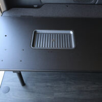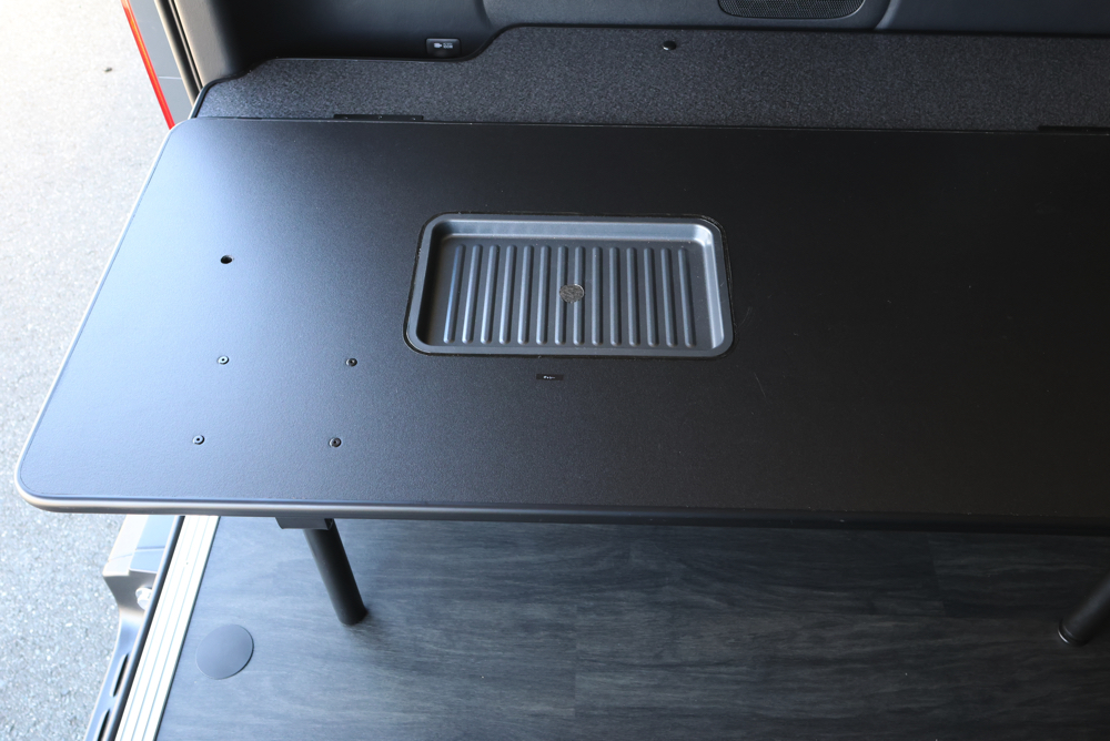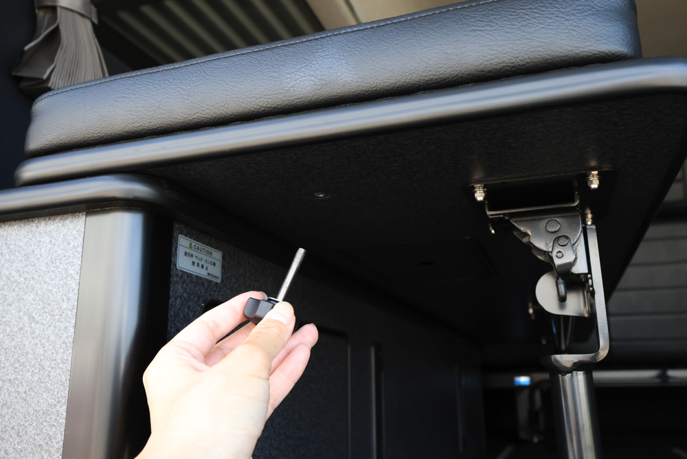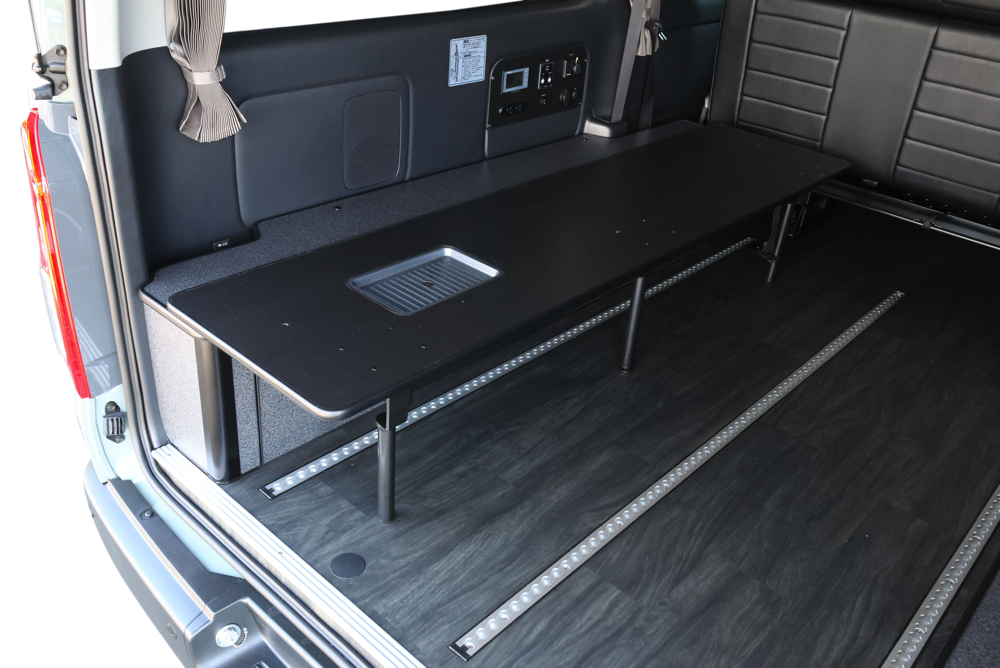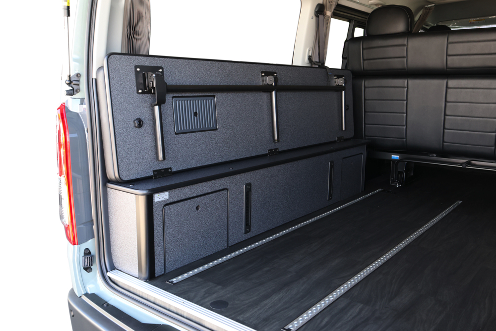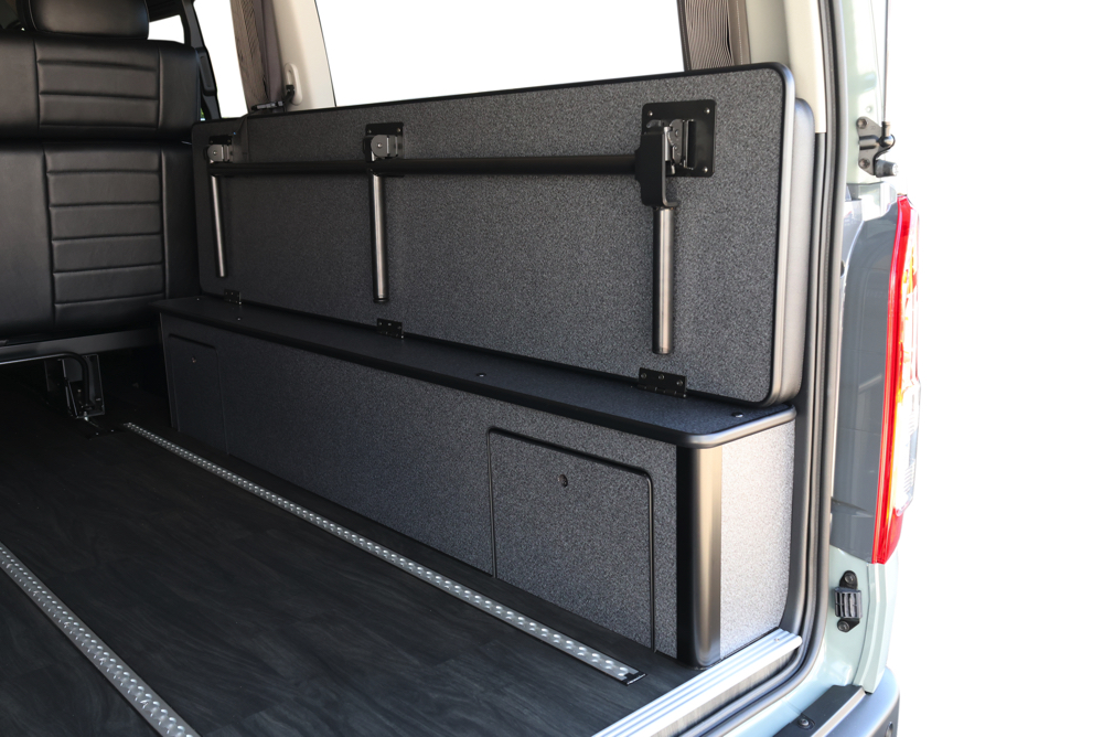 助手席側のフリップベッドには8ナンバー登録に必須なギャレー設備を搭載しました。普段はベッドマットを被せておくことでベッドとして使用できるので邪魔にならず、必要な時だけマットを外すことでギャレー設備として使うことができます。
