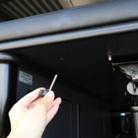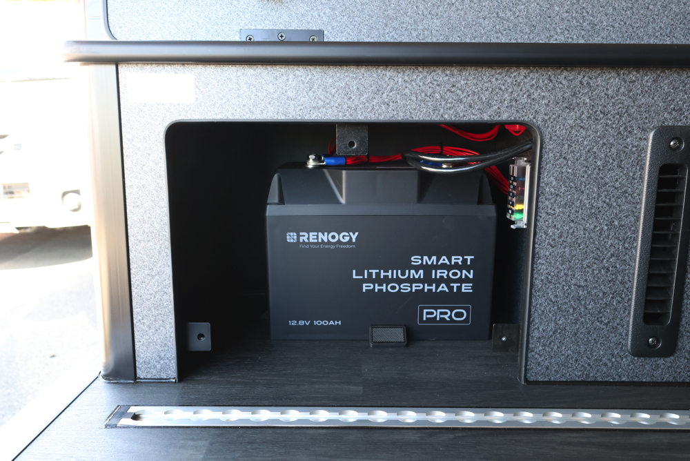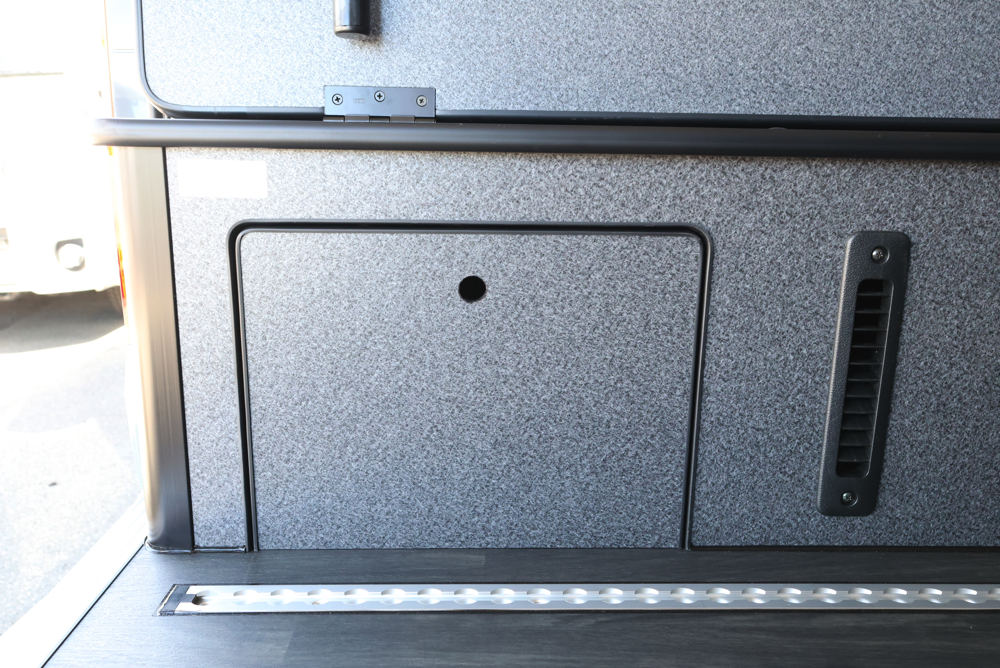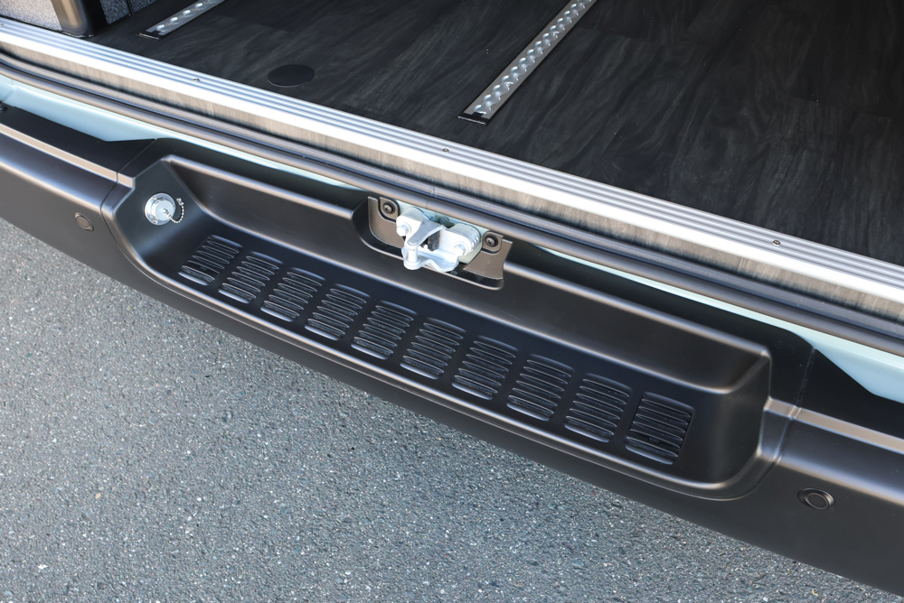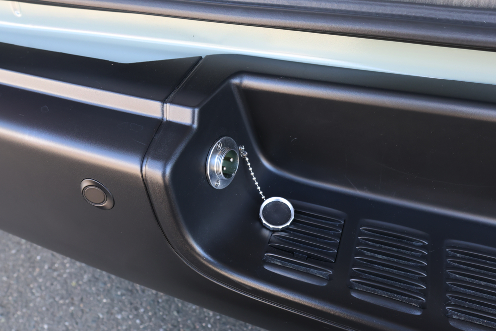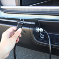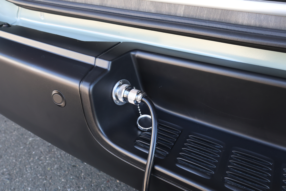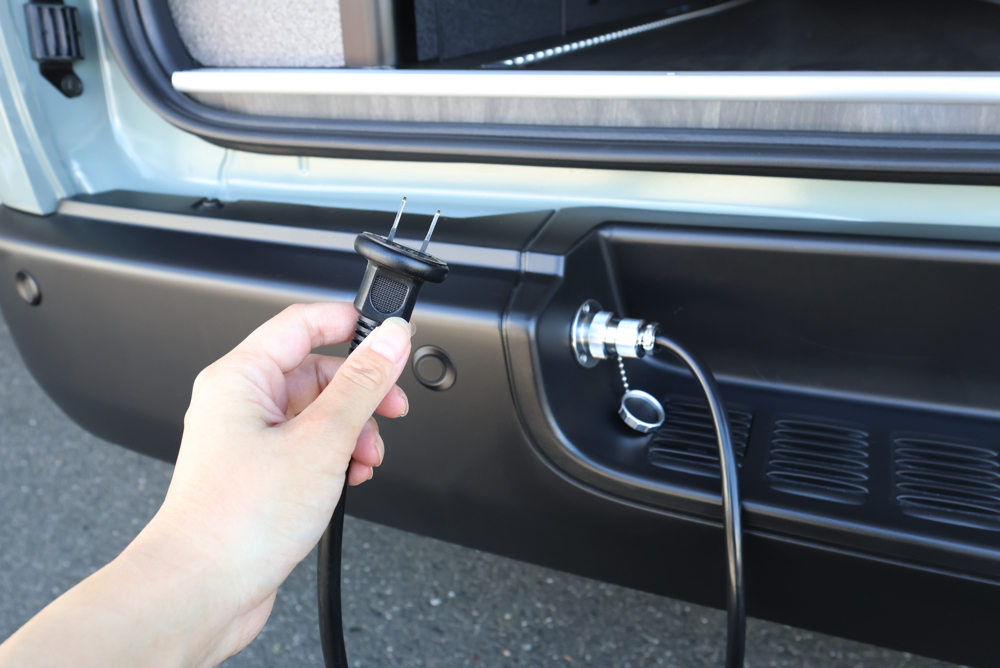 サブバッテリーシステムと一緒にSH外部電源システムもカスタムしました。電源サイトがあるキャンプ場やRVパークで電気の供給が行えたり、自宅でサブバッテリーの充電を行うことができます。今回はリアステップ部分に外部電源システムのコード差し込み口を設定しているので、使用しない時は邪魔にならず外観の見た目も損ないません。