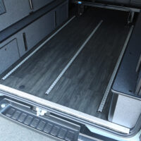 車中泊・バイクトランポを製作するにあたってまず基本となるのがSH床貼り施工。荷室全面をクッションフロアで貼り上げているので住宅のようなフラットな床が実現。ベッドを支えるのはもちろん汚れを気にせず遊び道具を積載していただけます。また今回はバイク固定用のワンタッチレールを床に埋め込みました。バイクのサイズに合わせてレールにフックを取付つけ、ベルトでしっかり固定することができます。