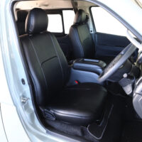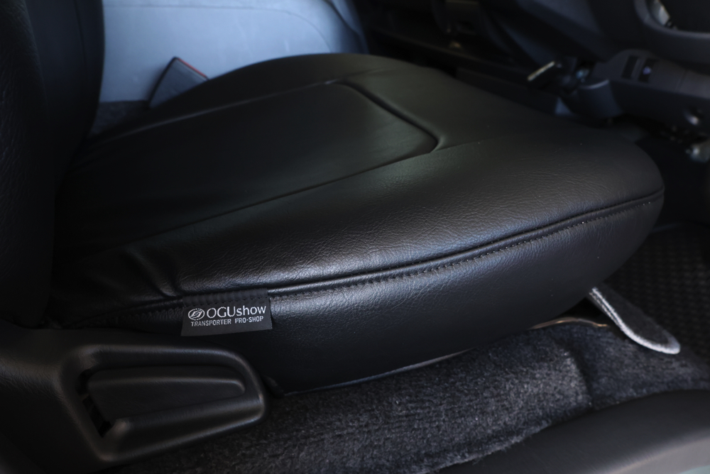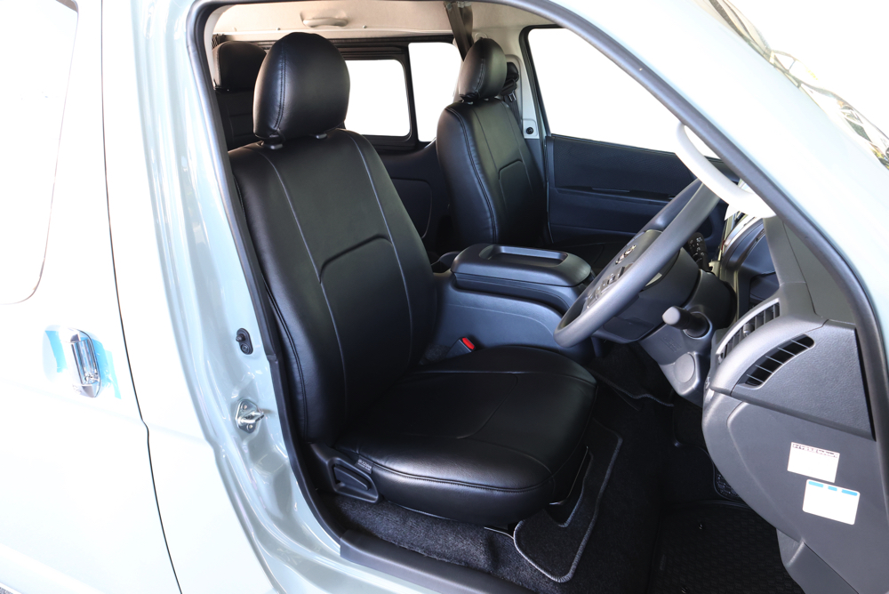 フロントシートには自社で製作しているオリジナルESシートカバー(ブラックレザー)を装着。傷や汚れに強いレザーになっているので、被せるだけでワンちゃんの引っ掻きや、キャンプでついた汚れから純正シートを守ります。
