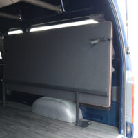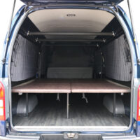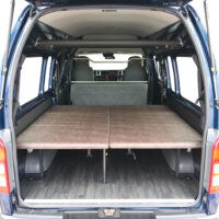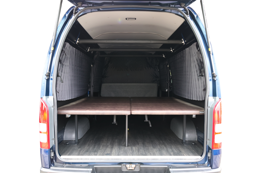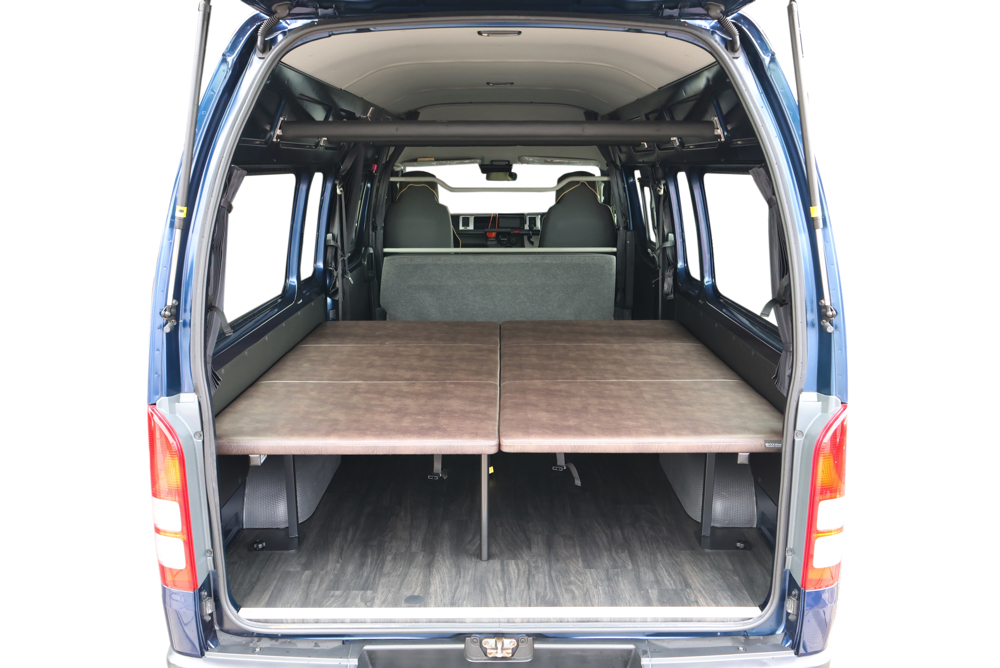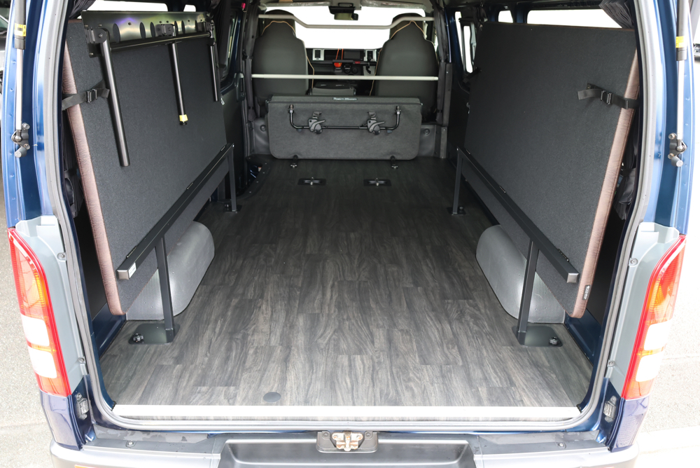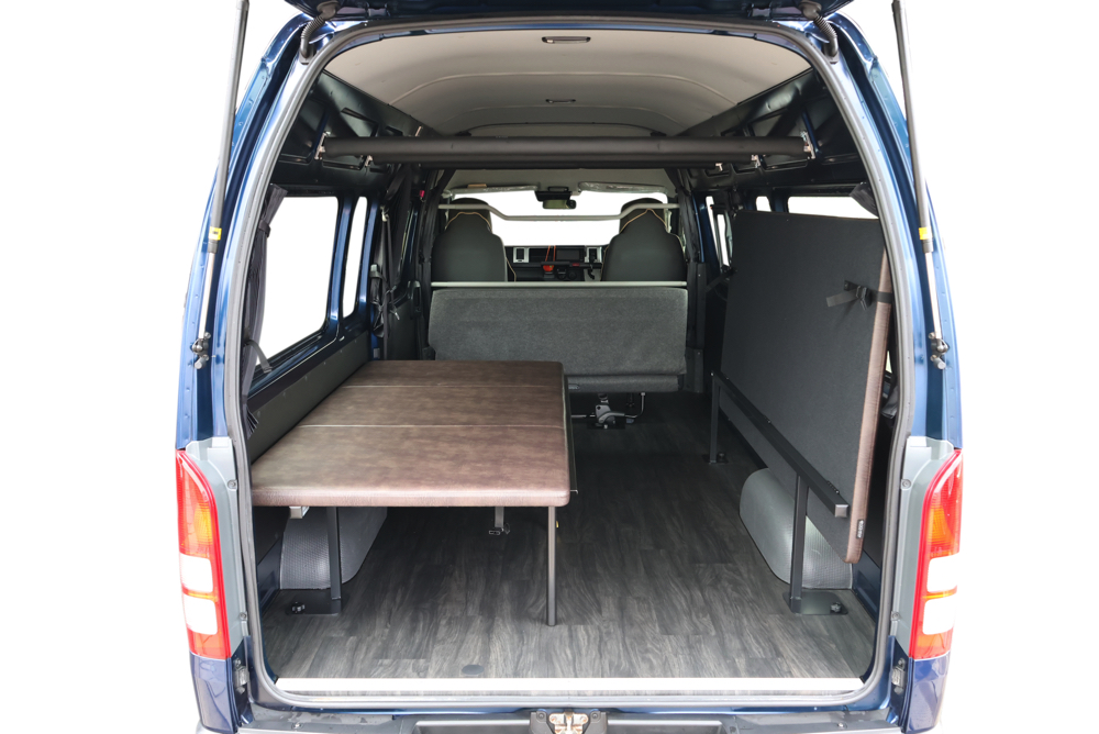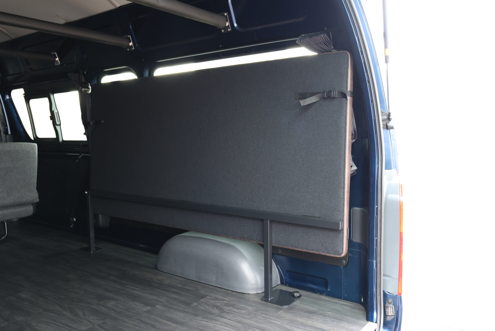 車中泊仕様のベッドには、ESフリップベッドを採用しました。跳ね上げ式の構造で、全面展開・片側展開・収納状態の3パターンへ切り替えが可能なため、用途や就寝人数に合わせて柔軟にアレンジできます。
