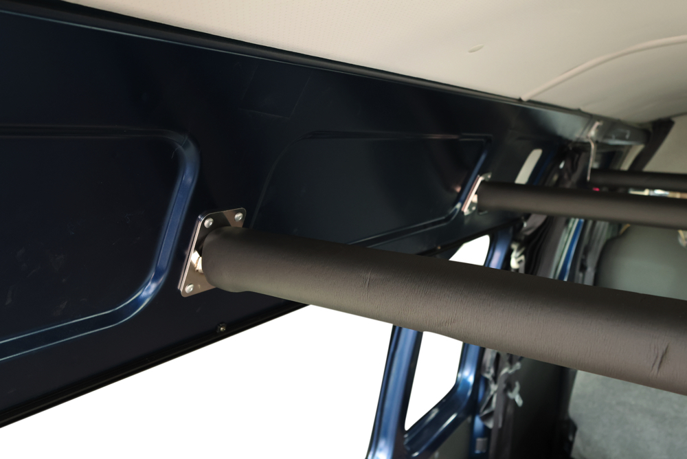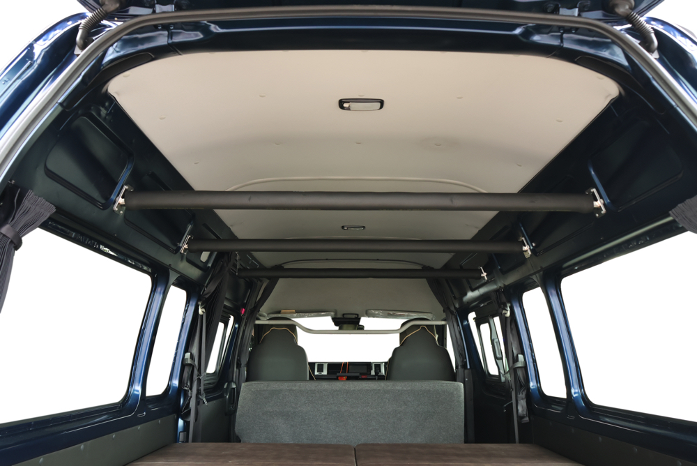 天井の3箇所にラックを取付けることで、ロングボードの積載にも対応。ボードを積んだ状態でも室内空間をしっかり確保できるため、快適に車中泊を楽しんでいただけます。