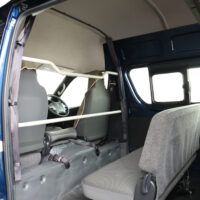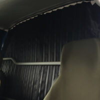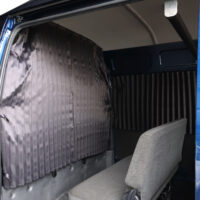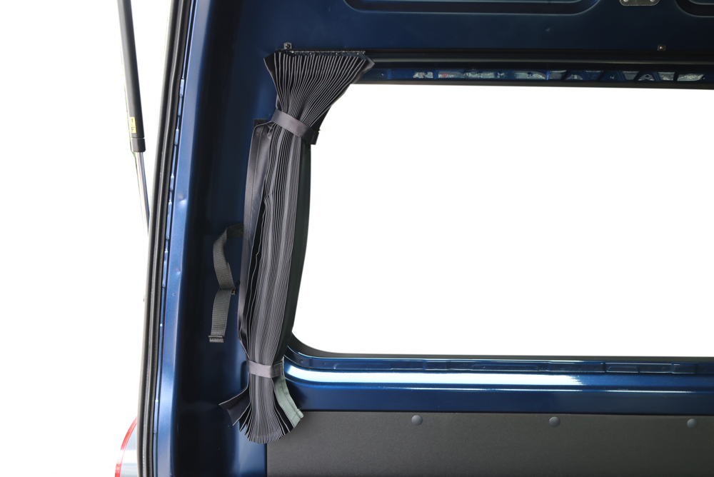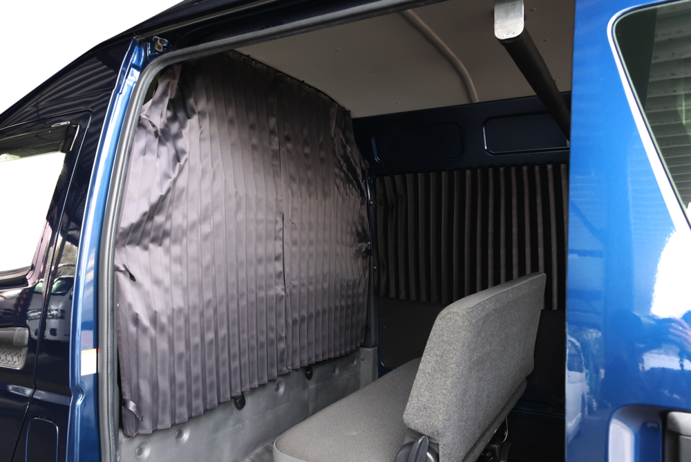 車中泊する時や波待ち合間の休憩の時、外の光や視線を気にせず休めるようにカーテンを取付けました。耐光性の高い生地を採用しているため、外からの強い光を遮り、室内で快適にすごしていただけます。