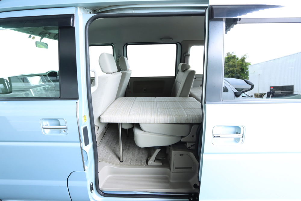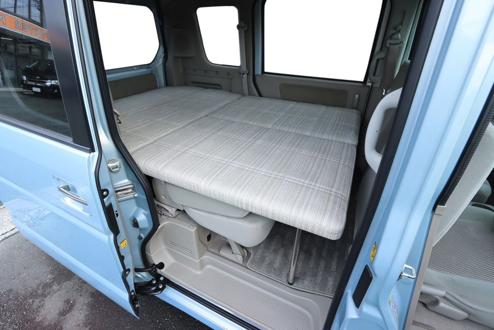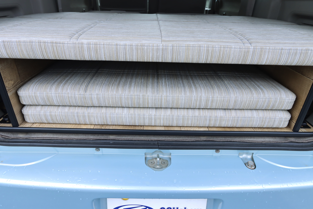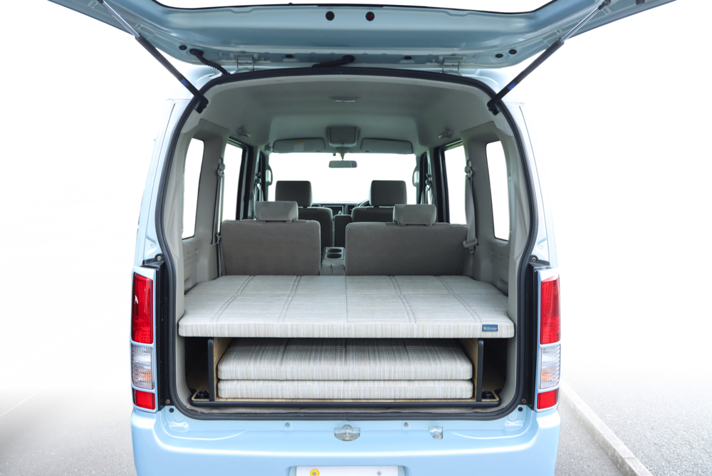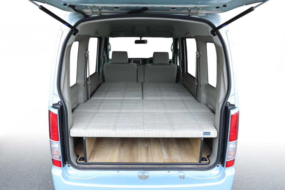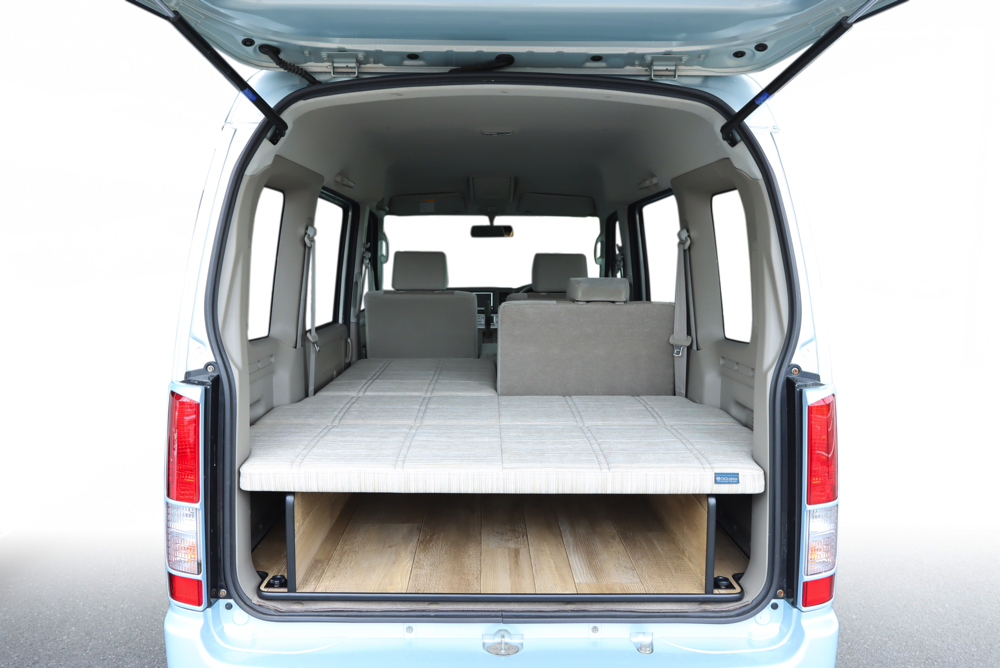 エブリィ内装に合わせて特注製作した新品ベッドが設置されているので、車中泊を楽しんでいただけます。